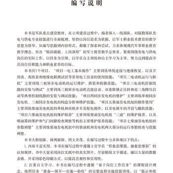 图书简介 | 本书针对军地通用的发电与供电专业岗位能力需求,以75GF康明斯柴油发电机组、50GF康明斯柴油发电机组和固定台站6kW柴油发电机组等三型电源装备为载体,梳理出21个发电与供电专业士官岗位典型工作任务,并归纳为7个学习项目:电工基本操作、电动机运行与拆检、电动机控制线路的安装与调试、同步发电机的维护、柴油发电机组的操作使用、柴油发电机组的维护保养、柴油发电机组的参数调整。 |