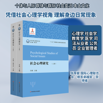 图书简介 | | 全书分为上下两部,以研究综述的方式呈现,内容丰富而全面,共有四篇:第一篇是个体与人际篇,第二篇是群体与群际篇,第三篇是社会与变迁篇,第四篇是本士与文化篇;汇集了37个研究主题,都是发生在我们身边的现象。在信息爆炸的当今,这种汇集问题的阐述方式,适应于读者快速扩展视野、理解知识、掌握方法。本书具有学术跨界交流的特点,不只服务于心理学专业的读者,也为各界人士提供社会心理思考的视野,以提升社会服务的能力。本书适用于心理学、社会学、教育学、医学、司法等专业人士,政府公务员,企业管理者,社会心理服务人员等。在这个过程中,作者们在研究和观察的过程中关切社会问题,深刻地探讨了当前大家所关心的一些主题,如基于积极发展视角考察留守儿童的心理发展、讨论社区责任感的提升、研究个体主观幸福感的增进。从中可以看出作者团队胸怀的社会使命、学科情怀与科学愿景。 |