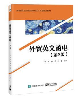 图书简介 | | 全书共14章,以国际贸易业务流程为主线展开,包括建立业务关系,询盘及回复,报价和报盘,还盘,订货及订单的执行,合同的签订,支付方式的选择,催开信用证、修改信用证和延展信用证期限,货物的装运和交付,包装及运输标志,海上货物运输保险,货物发生问题时买方的投诉,索赔与卖方的理赔等国际贸易业务的重要环节的信函写作。 |