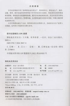图书简介 | | 本书从多角度介绍了各种锂电池及其生产、使用的特点,锂电池生产、储存、运输、使用、废旧电池回收利用等各个环节存在的安全隐患、事故原因分析和事故防范措施,锂电池安全性能测试标准,最后还有事故案例分析,其目的是普及锂电池安全知识,使更多的人了解锂电池,认识锂电池存在的安全风险,掌握正确的锂电池使用方法。 |