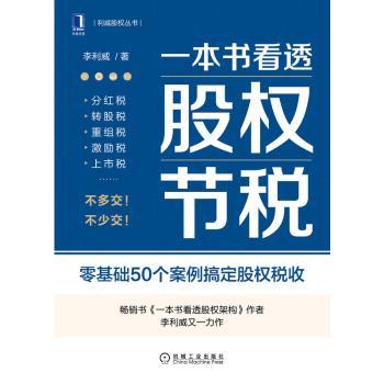 图书简介 | | 本书以“公司设立-公司扩张-公司收缩-公司上市-公司整合”为时间轴,涵盖了分红、转股、重组、上市、激励、代持等30个核心股权动作的税收知识点,并以指导股权实战为宗旨,剖析了不同商业模式对税负的影响,以帮助企业将税务规划融合到商业决策中。本书精选了公牛集团、三只松鼠、联想控股、吉祥航空等50个真实案例(部分案例的企业名称为化名)贯穿始终,语言通俗易懂,零财税基础的读者也能读得懂、学得会。 |