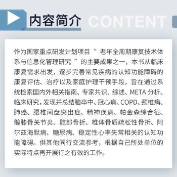 图书简介 | | 本书从临床康复需求出发,逐步完善常见疾病的认知功能障碍的康复评估、治疗以及家庭护理干预手段,旨在通过系统检索国内外相关指南、专家共识、综述、ETA分析、临床研究,发现并总结脑卒中、冠心病、COPD、颈椎病、肺癌、腰椎间盘突出症、精神疾病、帕金森综合征、髋膝骨关节炎、髋部骨折、椎体骨质疏松性骨折、阿尔兹海默病、糖尿病、稳定性心率失常相关的认知功能障碍。供其他同行交流参考,根据自己所处单位的实际特点再开展行之有效的工作。 |