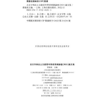 图书简介 | | 本书是2021年中国美院举办“古文字与出土文献”青年学者西湖论坛的论文集。该论坛为响应习近平总书记在致甲骨文发现和研究120周年座谈会的贺信中所提的要求,确保甲骨文等古文字研究有人做、有传承,鼓励年轻学者投入古文字和出土文献研究。本书收录2021年5月份在中国美术学院举办的“古文字与出土文献青年学者西湖论坛”上所讨论之论文,有邬可晶《金文“俦器”考》、郭永秉《从新出清华简资料看〈说文〉古文考》等二十余篇文章,涉及古文字考释、出土与传世文献互证、字形演变、用字演变等多个研究领域。 |