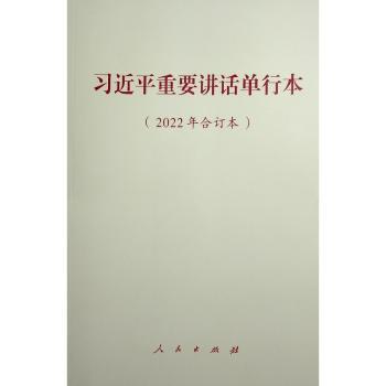 图书简介 | | 本书为2022年度习近平重要讲话单行本的合订本,共收入我社2022年出版的习近平总书记的讲话单行本9种、10篇。包括《携手共命运 一起向未来——在中国同中亚五国建交30周年视频峰会上的讲话(2022年1月25日)》《坚定信心 勇毅前行 共创后疫情时代美好未来——在2022年世界经济论坛视频会议的演讲》《在北京冬奥会、冬残奥会总结表彰大会上的讲话(2022年4月8日)》《在庆祝中国共产主义青年团成立100周年大会上的讲话》《在庆祝香港回归祖国二十五周年大会暨香港特别行政区第六届政府就职典礼上的讲话(2022年7月1日)《把握时代潮流 加强团结合作 共创美好未来——在上海合作组织成员国元首理事会第二十二次会议上的讲话(2022年9月16日)》《高举中国特色社会主义伟大旗帜 为全面建设社会主义现代化国家而团结奋斗——在中国共产党第二十次全国代表大会上的报告(2022年10月16日)》《坚守初心 共促发展 开启亚太合作新篇章——在亚太经合组织工商领导人峰会上的书面演讲(2022年11月17日)》《团结合作勇担责任 构建亚太命运共同体——在亚太经合组织第二十九次领导人非正式会议上的讲话》。 |