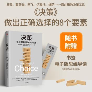 图书简介 | | 本书是关于决策体系的指南,构建改变世界的“决策”。做出正确的决策,就能对别人施加影响力。我们每天都要做出决策,不论是在工作中还是在生活中。分析了选择架构涉及的所有因素,包括合理路径、组合偏好、选择架构目标、默认选项、选项数量、选项排序、选项描述、选择引擎的构建等。 |