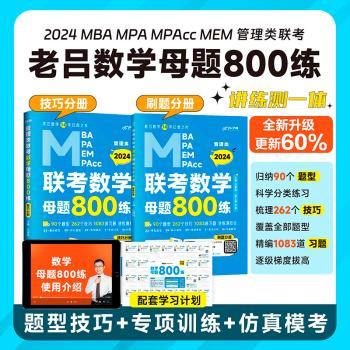 图书简介 | | 本书适用于管理类联考备考考生。本书一共分为三大部分,涵盖管综数学所有内容。其中第一部分按近十年的真题考察情况将考纲内所有题型分为基础篇、核心篇和低频篇,主张讲练结合,每个题型都设置习题,帮助学生进行学习、理解、训练;第二部分是针对核心题型的专项训练,让学生进一步巩固,训练题感;第三部分为4套管综模考题,按照真题的题型和题量编排,仿真模拟,提前感受考场氛围。通过对管综考试的深入研究,总结出适用于不同模型的多种方法,帮助学生快速找到最适合自己的一种;不同于常见的“因题施教”,本书将考试中会出现的易错点单独强调,让学生不只学会做题,更能避开出题“陷阱”。 |