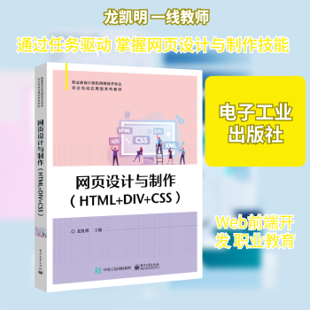 图书简介 | | 本书共10个单元40个学习任务,内容包括网页基础、HTML基础、CSS基础、网页文字、网页图像、网页列表、网页导航栏、表格、表单和网页布局。本书中的案例包括了详细的制作步骤,学生易学、易掌握。此外,每个单元后都附有针对性的实践任务,以巩固学生每单元所学知识,强化学生技能。 |