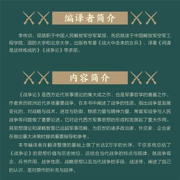 图书简介 | | 本书作者亲历欧洲近代多场重要战争,并结合自己的战斗经验和对战争的思考,系统阐)述了军事与政治、战略与战术、进攻与防御、物质力量与精神力量、常备军战争与人民战争等问题的关系,对近代西方军事思想的形成和发展起了重大作用。其思想谋略和智慧已远超军事范畴,为后世的诸多政治家、外交家、企业家在重大决策时提供指导与参考。 |
