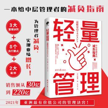 图书简介 | | 本书共六章,内容包括:舍弃管理者的六大“理想”、离职率由28%到4%的艰难历程——才望子低谷期的故事、通过“闲聊”了解员工的想法、轻量管理即彻底公开信息等。 |