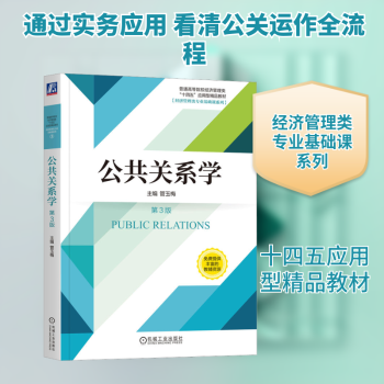 图书简介 | | 本书共分为五个篇章:基础知识篇、基本要素篇、活动过程篇、实务应用篇和发展趋势篇。第一篇主要介绍了公共关系的概念和作用,公共关系工作的方法和原则,公共关系的发展脉络,以及公共关系的基础理论。第二篇阐述了公共关系的三要素:主体、客体和互动。第三篇讲述了公共关系活动的四个步骤:调查、策划、实施、评估。第四篇是讲公共关系的实务应用,包括写作应用、语言艺术和公关专题活动的组织。第五篇是发展趋势篇,本篇在科技发展和全球化的大背景下,对公关实践的发展趋势进行了探讨。 |
