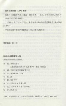 图书简介 | | 本书共分为四部分,主要内容包括:早期教育的真正起点——胎教;早期教育的关键期——婴幼儿时期;早期教育的黄金期——幼儿时期;治家文化、家庭教育与做合格的家长。具体内容包括:我国有悠久的胎教文化传统;我国胎教文化值得吸取的精华;德国老卡尔·威特的胎教经验和教训等。 |