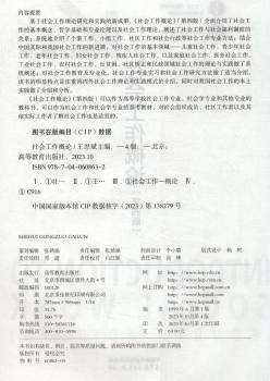图书简介 | | 本书介绍了社会工作的基本概念、哲学基础和专业伦理以及社会工作理论,阐述了社会工作与社会福利制度的关系;介绍了个案工作、小组工作、社区工作和社会行政等社会工作专业方法;对儿童社会工作、青少年社会工作、老年社会工作、妇女社会工作、残疾人社会工作,以及家庭社会工作、医务社会工作、工业社会工作、农村社会工作、反贫困、社区矫正和民政领域社会工作的理论与实践做了阐述;对社会工作教育及专业化、社会工作专业实习和社会工作研究方法做了适当介绍。 |