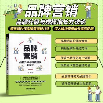 图书简介 | | 本书分为两篇,基础篇从品牌价值、敏捷团队、用户画像、品牌定位、优质产品、定价策略等方面对营销实战技巧进行一一讲述;进阶篇以现象级IP、视觉体系、自传播属性、尖文案、营销活动、新媒体矩阵、品牌杠杆、品牌活力为核心介绍流量裂变作方法。 |