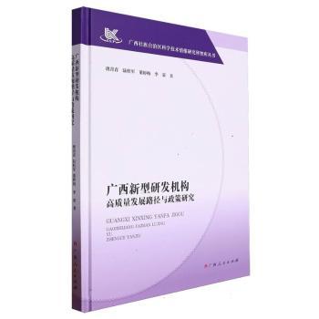 图书简介 | | 本书围绕广西推动新刑研发机构加快发展的部署要求,采用文献分析等多种研究方法,分析了广西新型研发机构建设发展现状和存在问题,构建了广西新型研发机构绩效评价指标体系,对广西获认定的新型研发机构发展绩效进行科学评价,研究提出了政策措施、发展路径和对策建议。 |