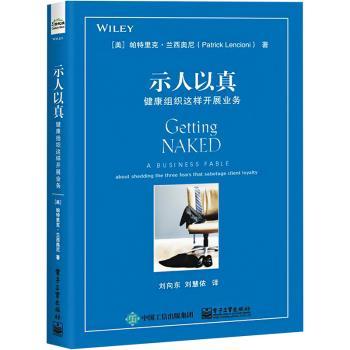 图书简介 | | 本书通过引人入胜的故事揭示了发人深省的商业价值观,根据作者创建的圆桌咨询公司十几年来的深刻经验,用幽默的、深入浅出的语言总结出服务业制胜的精髓所在,分享了咨询业的秘密和客户服务之道。书中提出“示人以真”的理念、“裸式服务”的概念,并总结了一个三大恐惧模型,对于组织领导者、顾问、销售人员及其他需要长期跟客户打交道的人来说,这个模型都揭示了一个服务者为何无法赢得客户的信任和忠诚的根本原因。最后,作者在书中总结了克服这些恐惧的具体方法,以使你取得成功。 |