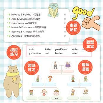 图书简介 |  | 本书为《超有效图解小学生英语单词》一书的配套练习册,也可以单独练习使用。全书按照单词的主题分类,分为24个章节,每章约设置8个大题,分别考查学生听说读写四个部分。全书共19种多样题型,能覆盖小学阶段各类考试的题型,穿插变换出现的题型,也增加了练习册的趣味性。 |