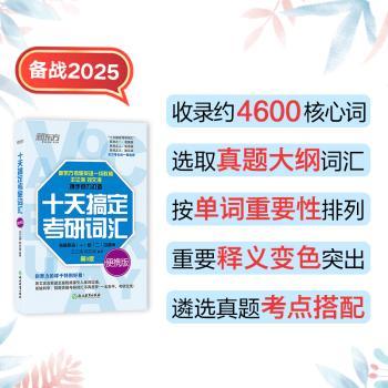 图书简介 | | 本书选取了考研真题中出现的大纲词汇和超纲词汇,并囊括了历年真题中词汇的考点搭配和重要用法。全书共分为20个List,采取循环乱序的排列方式,词汇讲解简明扼要,重点突出。本书的附录对应该掌握的核心前缀和后缀进行了总结,还梳理了国名、洲名、常用缩写等基础知识。 |