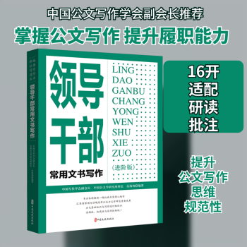 图书简介 | | 本书共分五章,包括领导者与公文处理、领导者实施公文处理的方法与技巧、领导干部常用公文的写作艺术、领导干部要带头改进公文文风、领导者常用文种写作。详细介绍领导干部公文处理与公文写作的规范、格式、技巧、方法及各种常用文种的写作。本书全面体现党和国家公文新条例、新格式的精神和要求,紧密结合机关,企、事业单位工作实际,反映当前公文学研究的最新成果,准确性、权威性和实用性相统一。 |