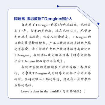图书简介 | 本书由浅入深地介绍了时序大数据平台TDengine的核心原理与实战案例。首先,本书为读者提供时序数据的基础知识和TDengine的核心特性概览,包括数据模型、数据写入、数据查询、流计算和数据订阅等;其次,详细介绍了TDengine的日常运维管理,包括安装部署、资源规划、图形化管理、数据安全等关键内容;然后,深入讲解了如何利用TDengine进行应用开发,涵盖多种编程语言的连接器使用、自定义函数的开发,以及数据订阅等高级功能;接下来,为数据库研发爱好者揭秘TDengine的内核设计,从分布式架构到存储引擎、查询引擎、流计算引擎,再到数据订阅的详细阐述;最后,通过分析典型应用场景案例,展示TDengine如何在实际业务中发挥作用。 |