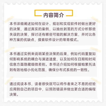 图书简介 | 本书详细阐述如何在设计、规划和实现软件时做出更好的决策,通过真实的案例,以抽丝剥茧的方式分析那些失误的决策,探讨还有哪些可能的解决方案,并对比各种方案的优缺点,摸索软件设计的常青模式。本书通过实例来说明某些决策的后果,例如代码重复如何影响系统的耦合与演进速度,以及如何在日期和时间信息方面隐藏细微差别。本书还介绍如何根据帕累托法则有效地缩小优化范围,确保分布式系统的一致性。 |