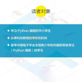 图书简介 | Python简单易学,是一种非常适合零基础编程人员学习算法与编程的高级程序设计语言。本书是中国电子学会全国青少年软件编程等级考试Python编程五至六级的指定用书,基于Python自带的集成开发工具IDLE 3.5.2版本,对应每级考试要求讲解知识要点。本书能够指导广大青少年学习者了解并掌握Python编程技巧,培养他们用Python编程解决生活中实际问题的能力。 |