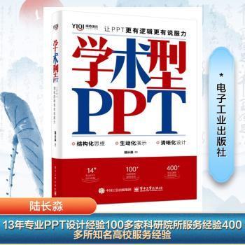 图书简介 | 本书是一本集高效思维与可视化呈现为一体的学术型PPT演示图书,可帮助学术研究者、高校学生和科研机构的工作人员更轻松地掌握学术型PPT的制作精髓。本书针对学术型PPT的制作提供了一套完整、全面的PPT设计规范,涵盖内容逻辑、版面设计、动画制作、演讲录制、项目实操等多个方面,旨在从多角度出发,重点突出、层次分明、有理有据地进行体系化表达和演绎,帮助读者轻松地呈现高质量、有逻辑的内容。通过本书案例的直观示范,以及案例制作前后的对比讲解,搭配系统的基础操作视频,读者可以更好地学习PPT的制作。 |