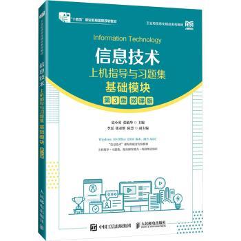 图书简介 | 本书是《信息技术(基础模块)(第3版)》一书的上机指导与习题集,共两部分。第一部分是上机指导,该部分从计算机的使用、文档处理、电子表格处理、演示文稿制作、信息检索、新一代信息技术概述、信息素养与社会责任7个方面组织内容,读者可以按照《信息技术(基础模块)(第3版)》中的内容和本书中的指导进行上机操作;第二部分是习题集,该部分根据《信息技术(基础模块)(第3版)》中的内容编写,题目类型包括单选题、多选题和判断题3类,方便读者进行自测、练习。 |