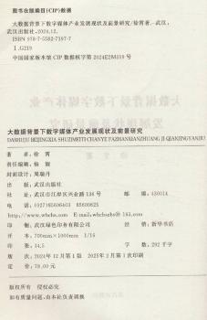 图书简介 | | 本书主要阐述随着社会经济的快速发展以及时代的不断进步,我们逐渐步入大数据时代,在数字媒体、新媒体得到了飞速的发展的同时,给传统媒体带来的巨大挑战。同时论述了现在高新技术迅猛发展,数字化信息时代不断进步,数字媒体行业作为一个充满前景的庞大的新兴行业已经给社会提出了新的要求,以及各政府的高度重视、给予的支持和相关政策发展规划。数字媒体衍生出的数字媒体产业链也是非常值得我们研究的,因此,在大数据的背景下对数字媒体发展应用研究具有重要的意义。 |