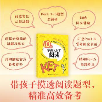 图书简介 | | 本书详细解读了KET考试改革后阅读部分的备考内容和考试重点,为考生规划了10天的阅读备考方案。Day1详细解读改革后的题型,给出官方备考建议;Day2用中英对照的方式呈现官方样题,帮助考生快速了解考题;Day3讲解KET阅读必备技能,如寻读、略读、抓取关键词等,以及KET阅读常见从句类型;Day4-Day8详细介绍阅读Part1、Part2、Part3、Part4、Part5的题型、答题技巧和答题步骤,汇总归纳常考的词汇、搭配及语法知识;Day9-10提供五套阅读仿真模拟题。 |