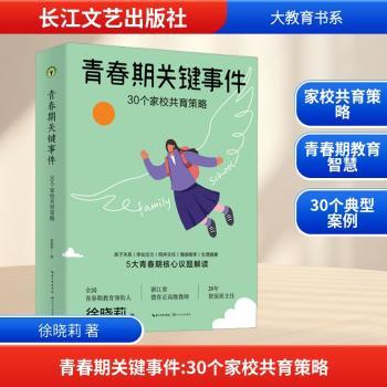 图书简介 | | 本书关注青春期孩子的教育问题,分为“亲子关系和代际冲突”“学习和就业管理”“同伴关系和人际交往”“情感和情绪管理”“性发育和性教育”五个章节。作者徐晓莉老师任初中班主任近三十年,对处理青春期孩子的各种状况,经验丰富,拥有许多把“事故”变成“故事”的智慧。在这本书中,徐老师通过30个故事,讲述家校共育、妙解青春期问题的方法;形式活泼,案例丰富,每章配有操作流程图作为总结,旨在为和青春期孩子打交道的老师家长们提供有效指导。 |