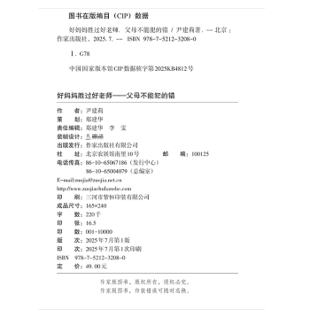 图书简介 | 本书围绕“家长不能犯的错”这一主题展开,共六章:求完美是最不完美的做法,严厉教育是危险教育,不做穿西装的野人,你的孩子不属于你,小事儿就是大事情,关于自闭症。其中,求完美是最不完美的做法建议家长放下求完美的执念,接受孩子本来的样子;严厉教育跟前一章理念一致,也是建议家长给孩子宽松的成长环境;不做穿西装的野人是反对家长无论肢体上还是行为上的暴力行为;你的孩子不属于你则探讨了父母尤其是母亲在孩子生命中的得体退出;而儿童的竞争、金钱观和寄宿行为的可取与否,是看似不大却对孩子众生产生重大影响的事情;最后是关于自闭症的讨论,让家长擦亮眼睛,科学判断自己孩子的真实情况。 |